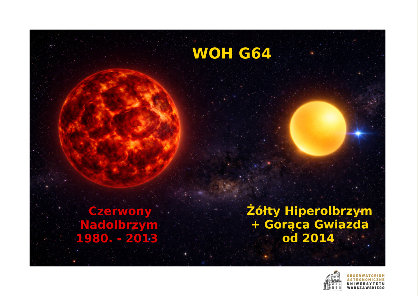 Międzynarodowy zespół naukowców z udziałem astronomów z OA UW opublikował w czasopiśmie Nature Astronomy wyniki wieloletnich badań jednej z największych znanych gwiazd — WOH G64, znajdującej się w Wielkim Obłoku Magellana.
